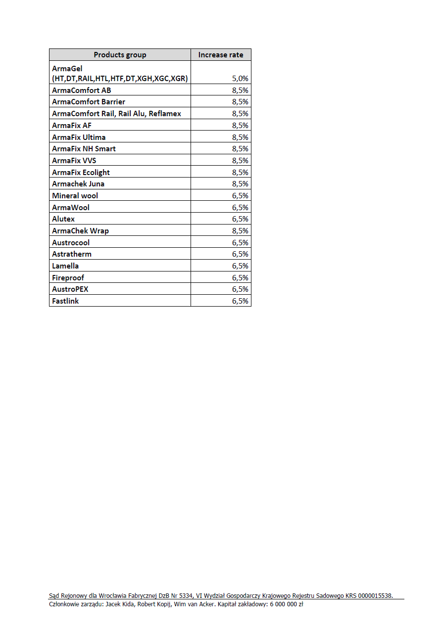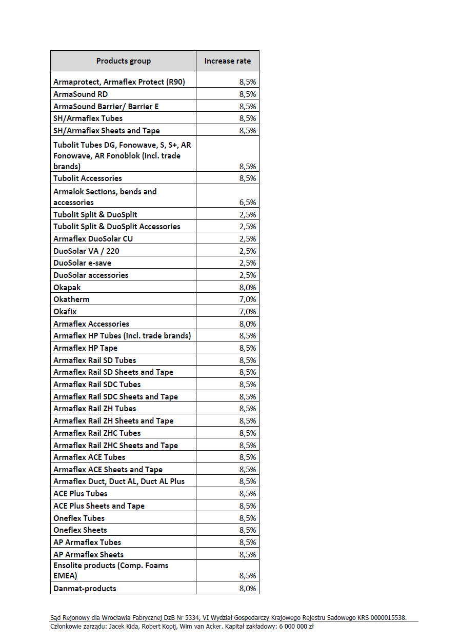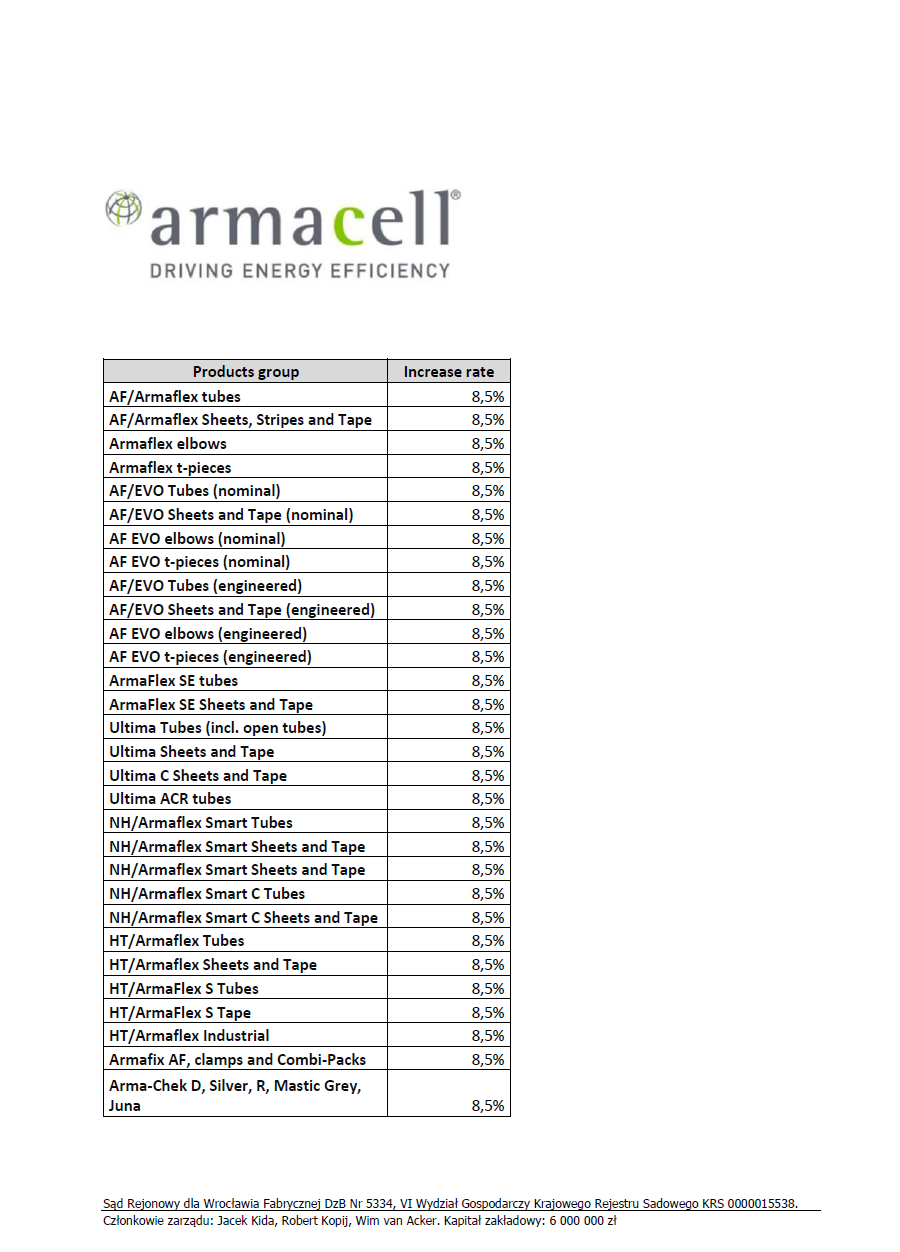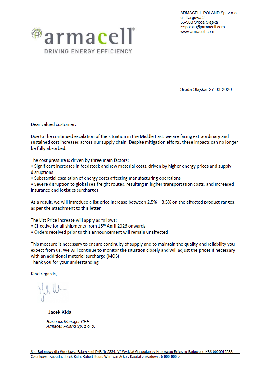 Oficiální oznámení změny cen produktů výrobce Armacell Sp. z o. o. od 15.4.2026