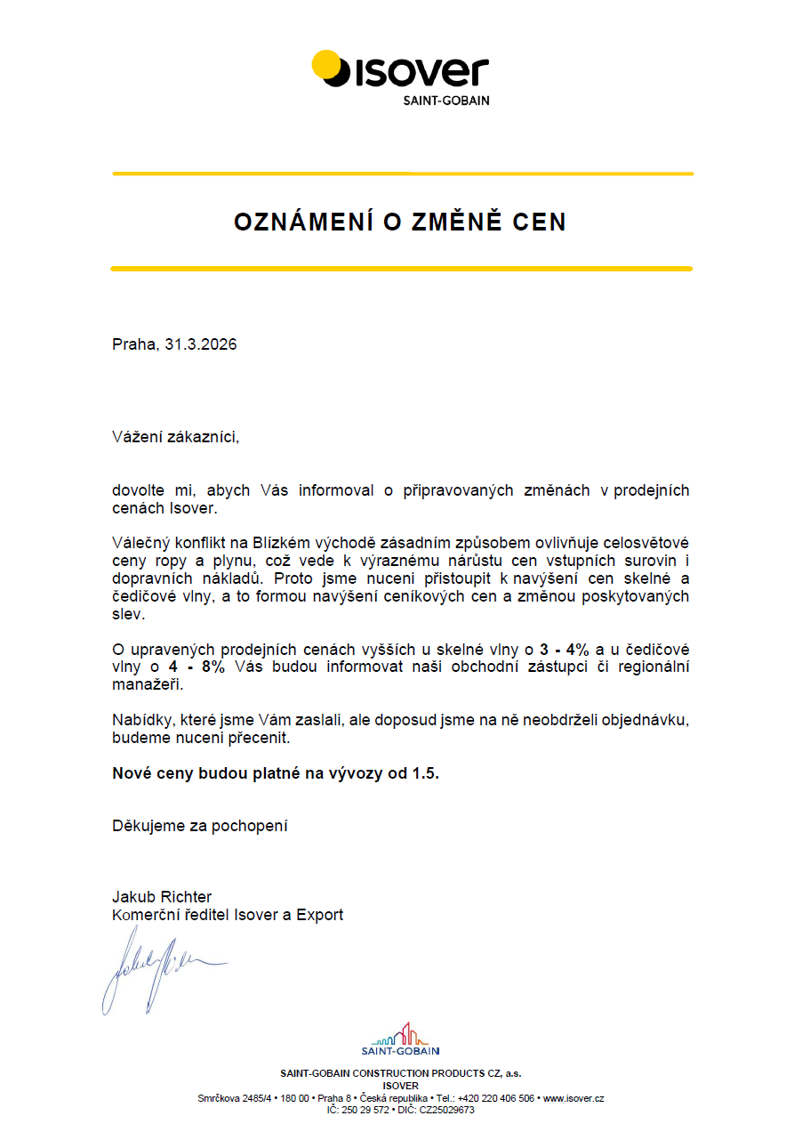 Oficiální vyjádření Isover o změně cen od 1.5.2026